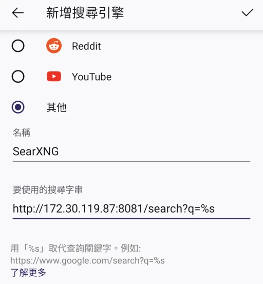 手機的話,開啟手機版Firefox,點選設定 → 新增搜尋引擎,如圖填寫加入SearXNG。由於手機是使用ZeroTier連線,所以localhost要換成電腦的虛擬區域IP。