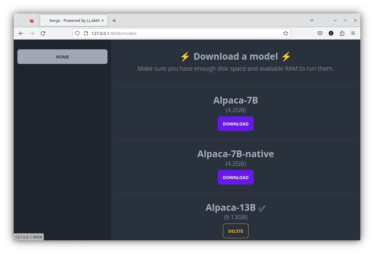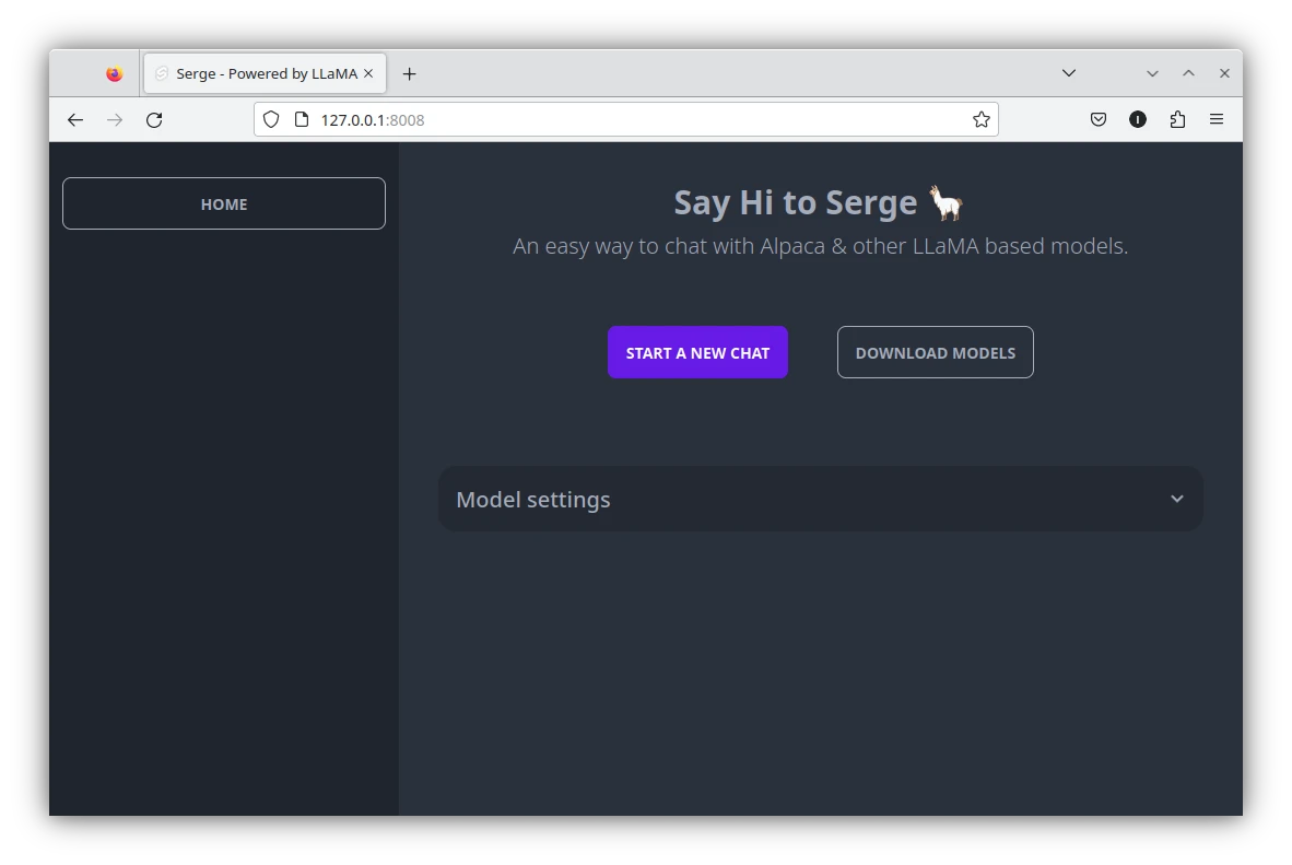 https://127.0.0.1:8008就可以看到Serge主畫面。