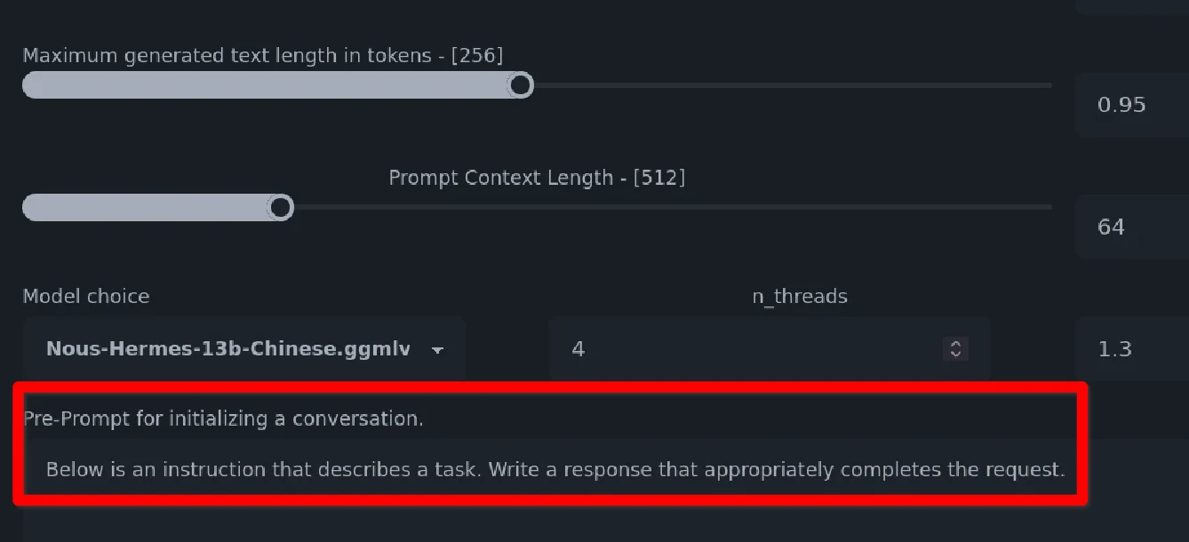Max size預設是512等於AI的記憶長度。如果你希望跟AI聊久一點的話,那就把這個值設定為2048,否則馬上就會到達context上限。Pre-prompt處的提示詞是要AI扮演的角色。GPU Layer是分擔給GPU運算的多寡,可提昇回應速度。