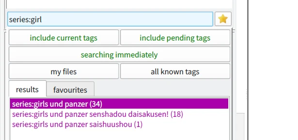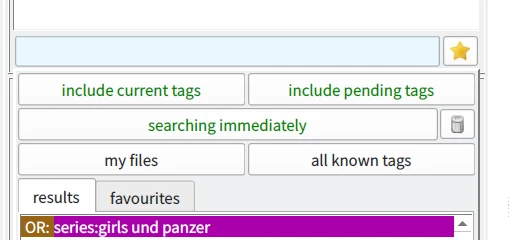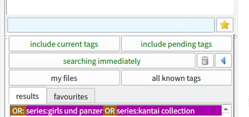 Hydrus預設的搜尋語法是AND,例如搜尋《少女與戰車》 和《艦隊收藏》的標籤,就只會回傳一張圖片裡同時有這二部作品的結果。