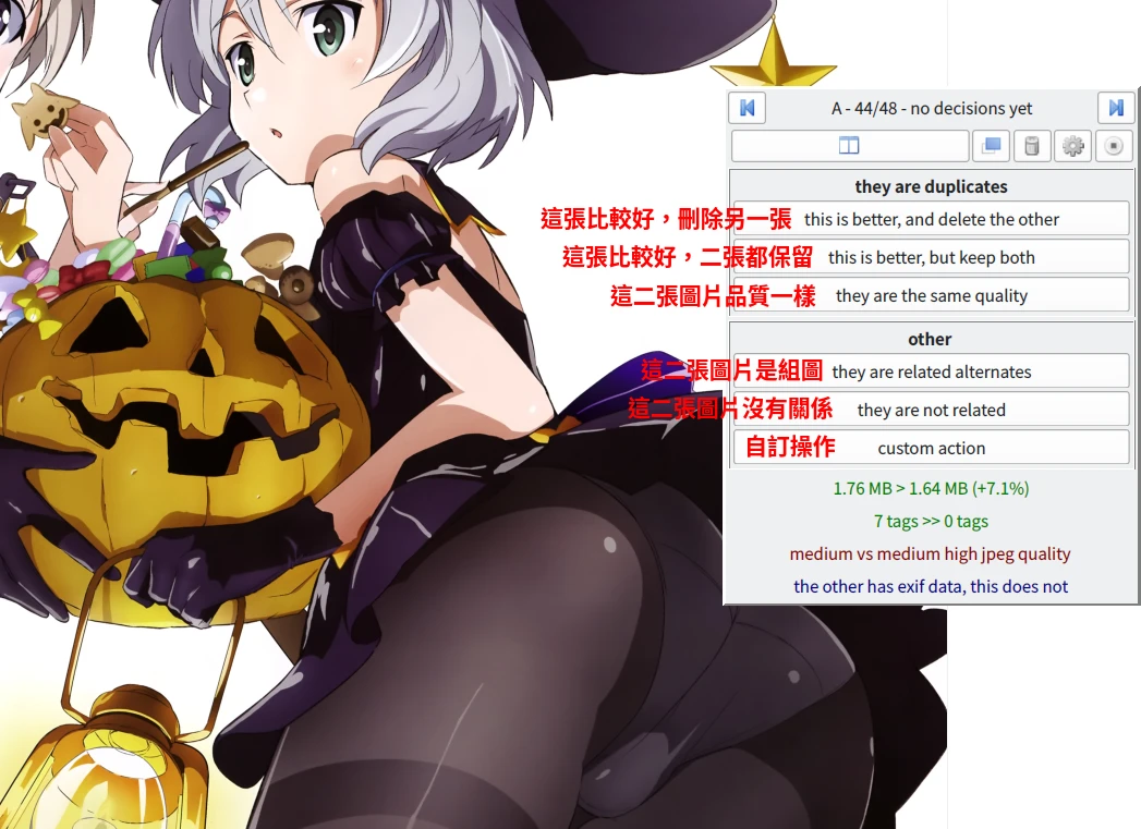 接著顯示可能重複的圖片,點一下圖片,滾動滑鼠滾輪,就會交替顯示二張圖片讓你比對。比對後按右邊的按鈕做決定。