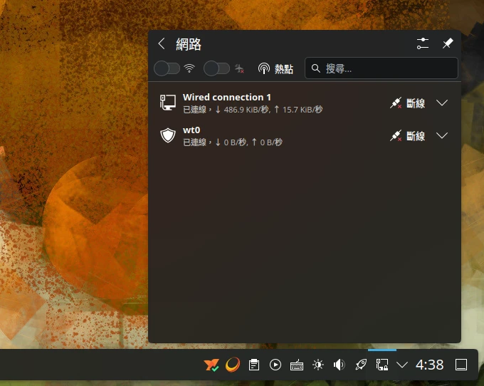 curl -fsSL https://pkgs.netbird.io/install.sh | sh這會安裝NetBird的執行檔與圖形界面,安裝之後會顯示在Linux桌面的系統匣。NetworkManager連線面板會多出一個WireGuard連線,不要把它斷掉呀嘿。