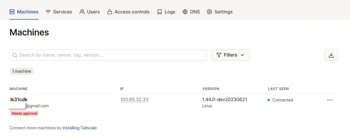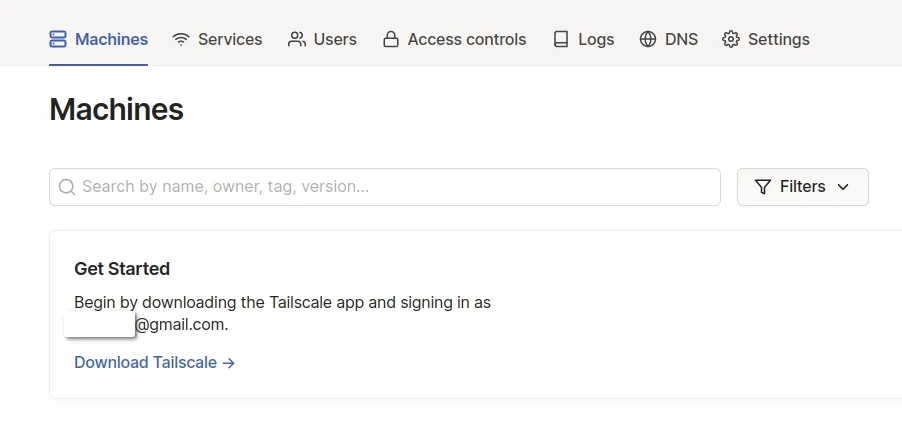 登入後Machines面板是空的,需要在裝置安裝Tailscale,將其加入網路(Tailscale安裝過程見下一節)。