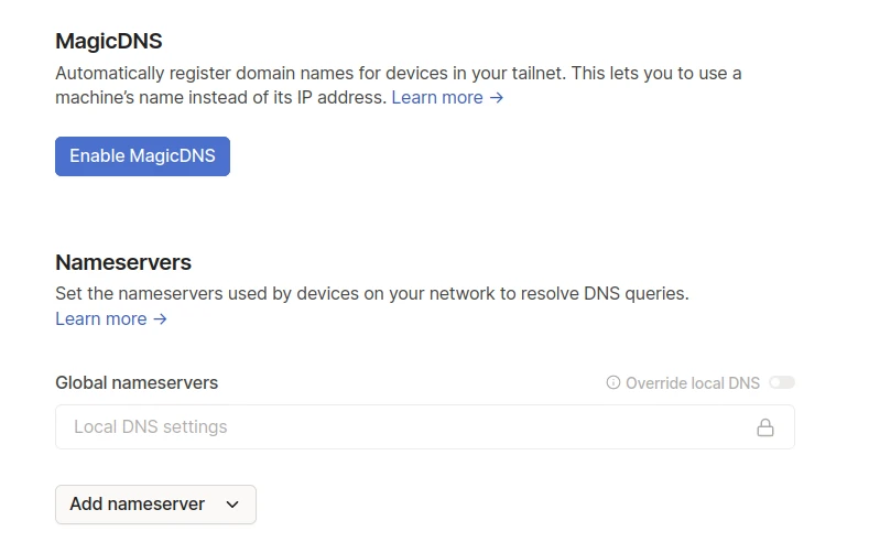 如果覺得記IP太麻煩,你可以到Tailscale的網頁後台 → DNS啟用Magic DNS。手機有使用私人DNS伺服器的記得也要在下方Nameservers填入DNS伺服器的IP。