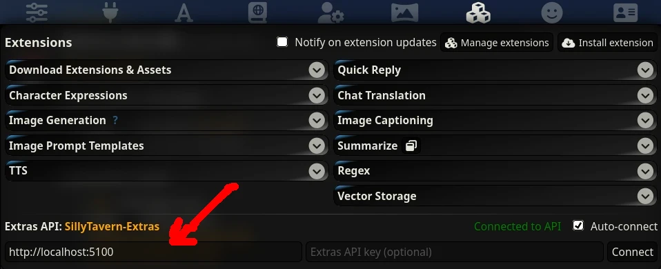 到SillyTavern的Extensions頁面,在Extras API欄位輸入預設網址