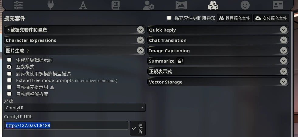 點選SillyTavern的擴充套件面板,在圖片生成填入ComfyUI伺服器的網址。如果是架在同一台電腦,那麼就填寫