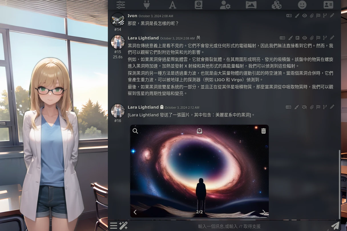 為什麼要AI繪圖呢?想像一下,在對話的時候讓AI把故事裡的場景畫出來~讓畫面更有沈浸感,好比在森林中走路,繪製前方看到的景色,或是遭遇到的敵人等等。
