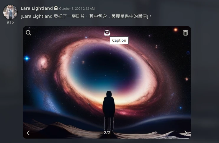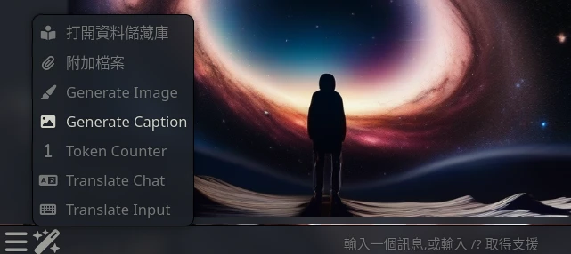 按聊天欄的按鈕呼叫語言模型出來給圖片下註解(caption)。我是不知道這功能有什麼用,因為AI也看不到這條訊息就是了。