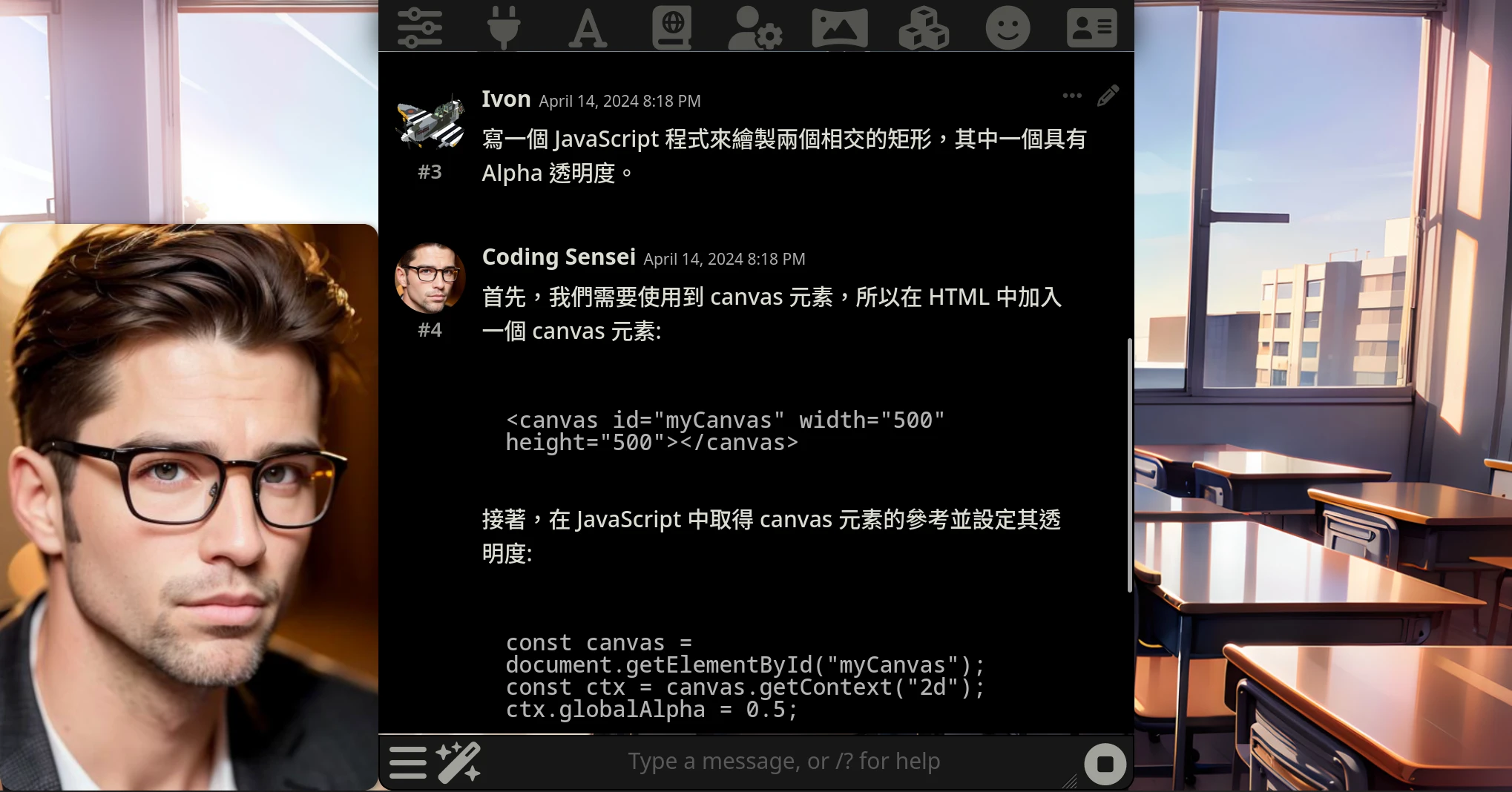 第二種,在自己的電腦同時跑大型語言模型+語音合成引擎+AI生圖的服務。這樣非常吃效能,建議準備一張Nvidia RTX3060以上等級的GPU,還有16GB以上RAM的電腦。沒有GPU用CPU跑的話也是可以啦,但生圖這部份會非常慢。
