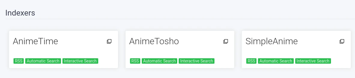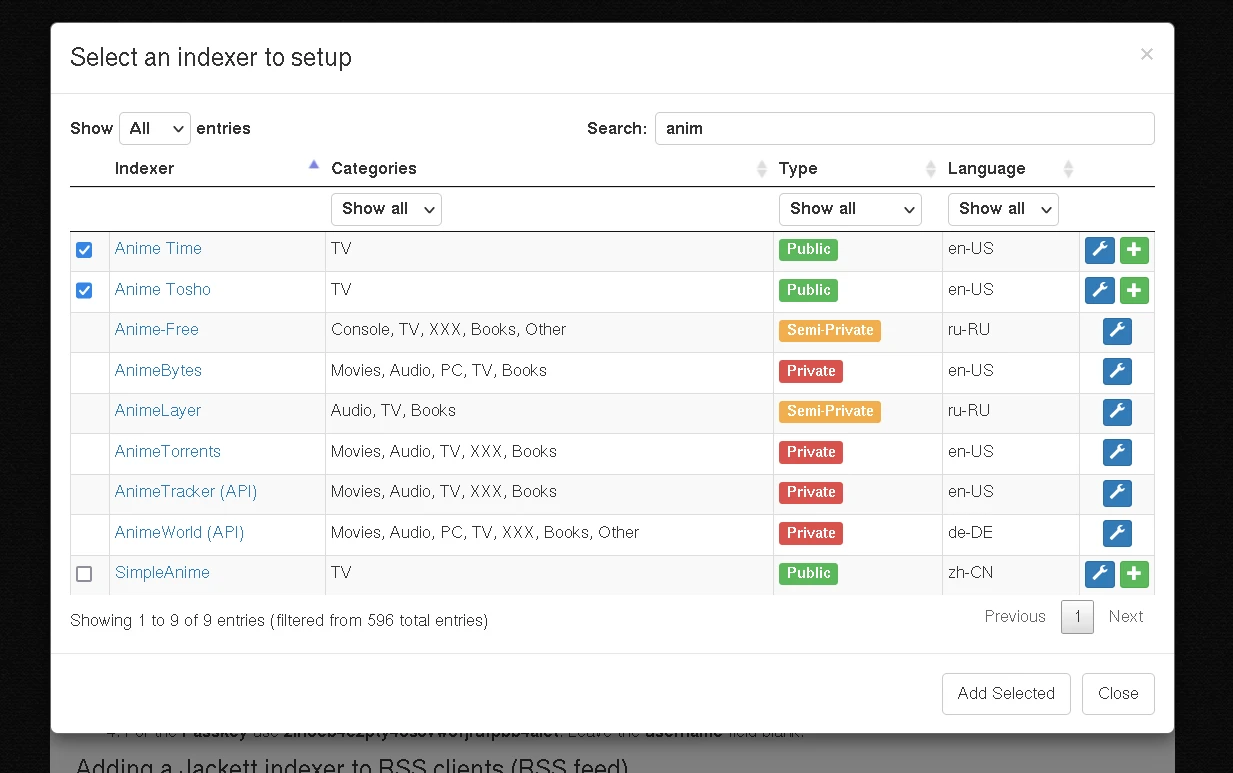 勾選三個動漫索引器:Anime Tosho(英文)、Anime Time(英文)、Simple Anime(中文),點選Add Selected