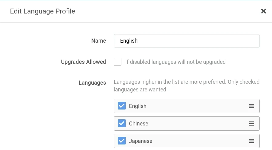 我設定優先度依序為日文、英文、中文。這樣Sonarr就會優先搜尋日語版影片,而不會抓到配音版。