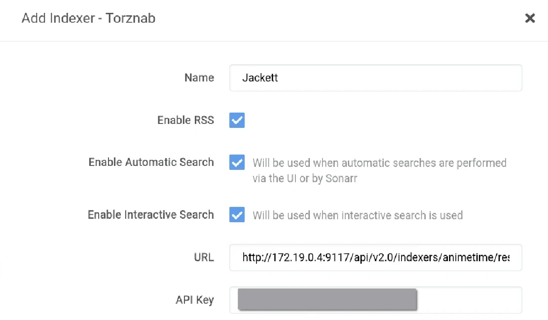 回到Sonarr頁面,在網址貼上Copy Torznab Feed網址和API Key。記得網址的