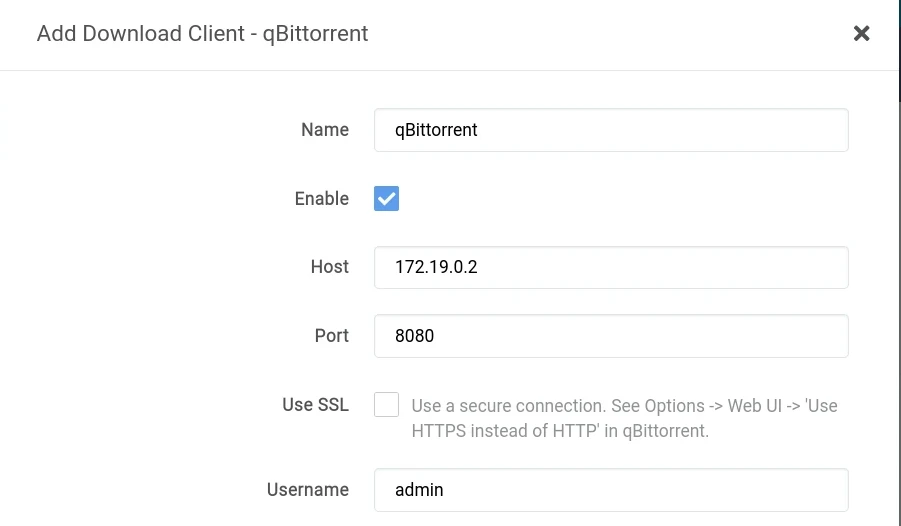 填入qBittorrent的容器IP(同樣要使用Docker容器的IP),以及WebUI的帳號密碼