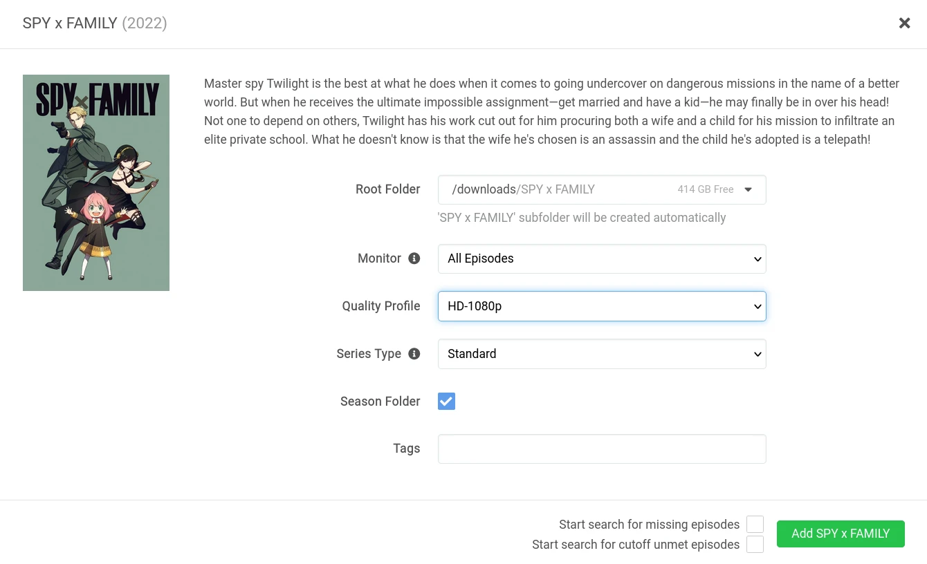 接著設定下載的root folder,指向/downloads。每部動畫它應該會自動新增一個資料夾存放。