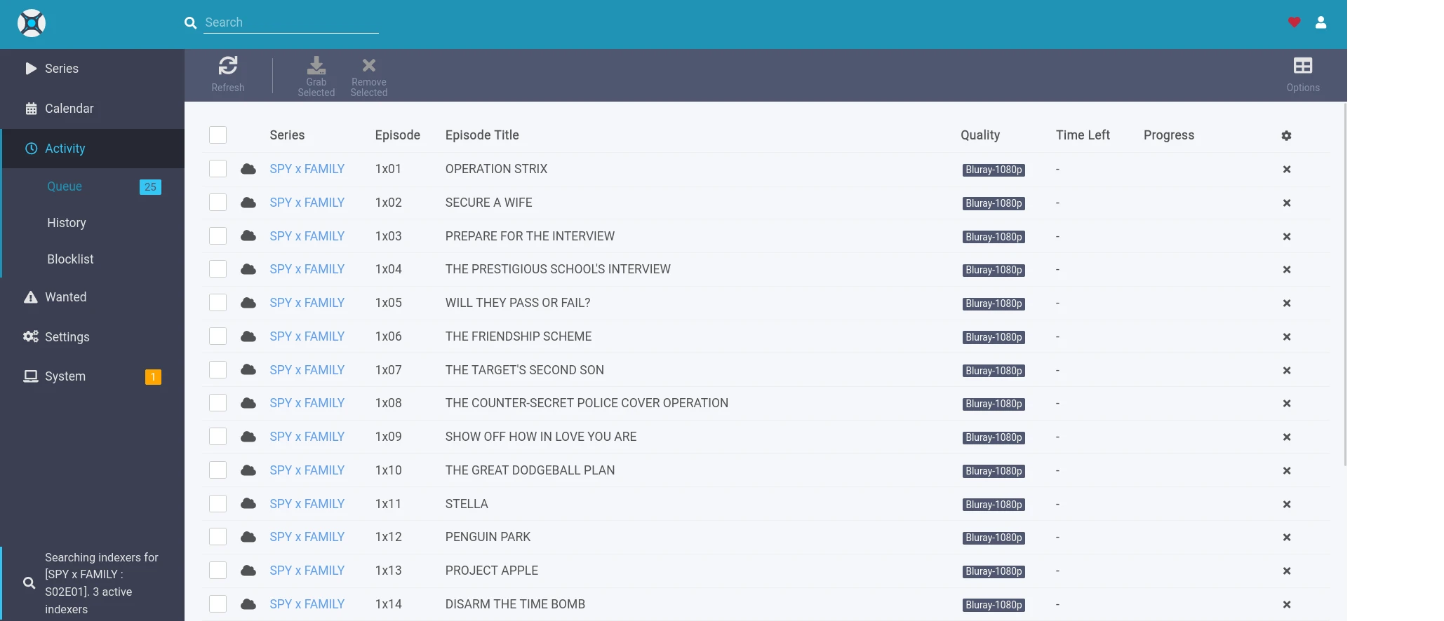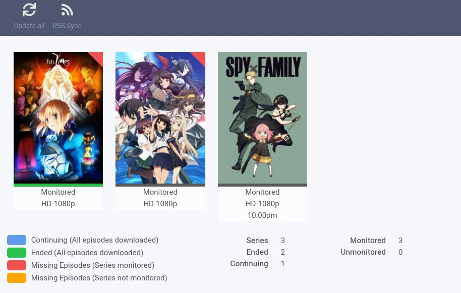 Sonarr首頁會顯示進度條,綠色代表下載完成,藍色代表下載中,紅色代表缺少集數,橘色代表缺少集數且尚未監測。