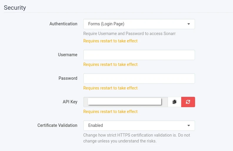 切換到General → Security,Authentication選Login Page,設定Sonarr網頁登入的帳號密碼。