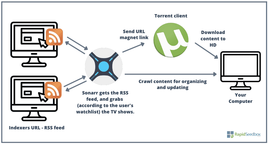 那麼Sonarr扮演的具體角色為何?請看RapidSeedbox製作的原理圖:Sonarr透過類似RSS的索引服務,找網路上的種子檔案,並將其傳給BT下載軟體。