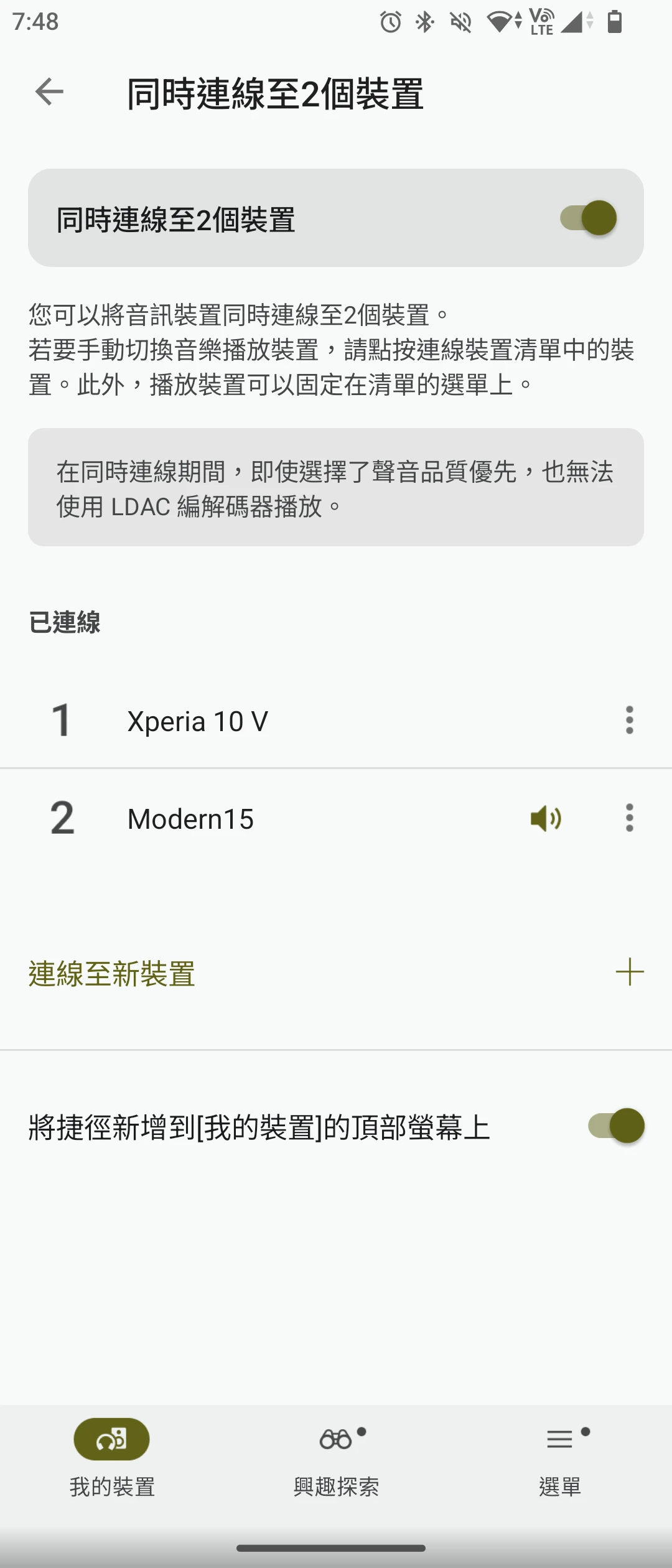 最多同時配對兩個裝置,它會嘗試根據播放音樂的來源自動切換。不過WF-C510沒有配戴偵測的感測器,不會在拿下之後自動停止音樂播放。