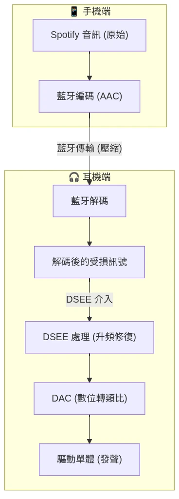 DSEE是將MP3等級音訊用AI升頻到FLAC音質的技術。可是我聽的Spotify已經有無損音質了耶?不對…即使無損音質,壓縮傳到藍牙耳機後還是會變成有損。