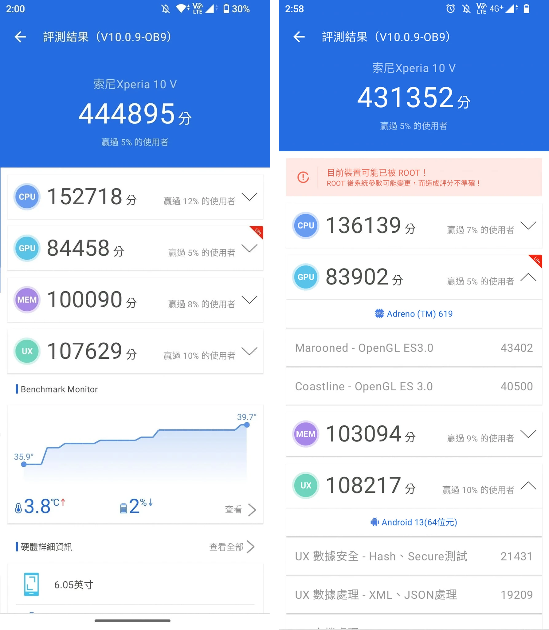 安兔兔跑分結果表明,啟用KTweak模組(右)相較於原廠無root系統(左),整體性能下降了一些,但是UX(使用者體驗)是有改善的。