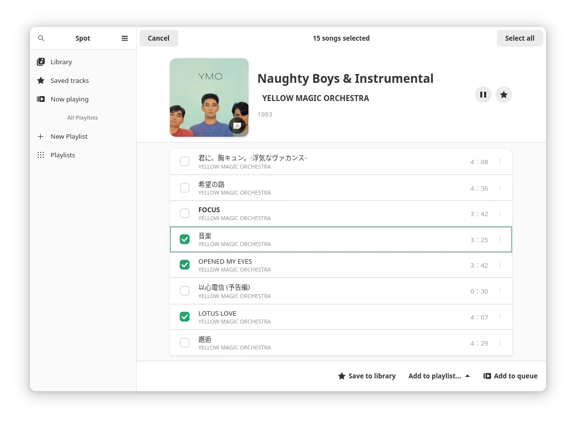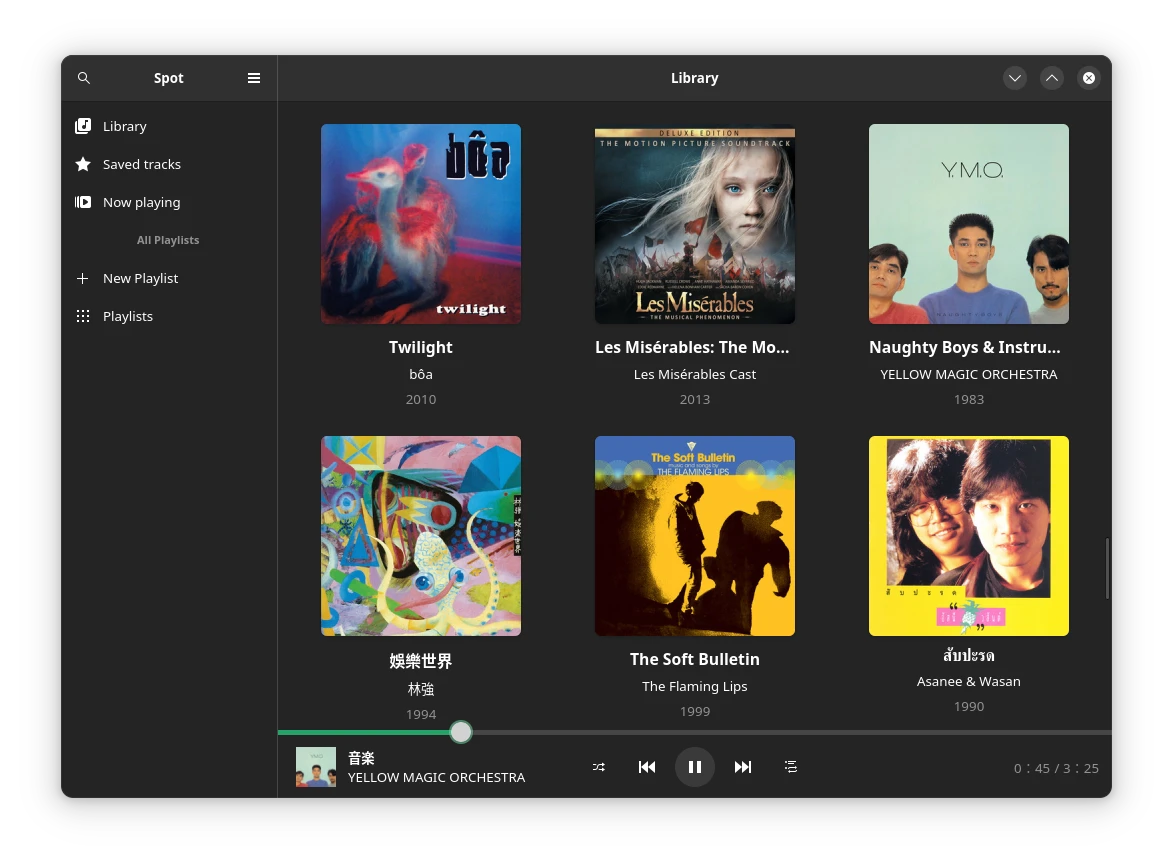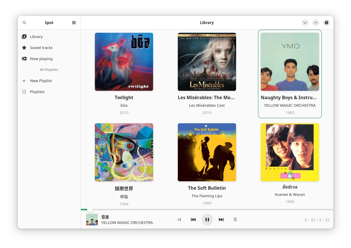 Spot是以GTK + Rust寫成的第三方Spotify客戶端,由xou816開發。使用原生程式框架,開啟快速,佔用資源小,即使是資源拮据的ARM裝置(如樹莓派)也能流暢播放Spotify。