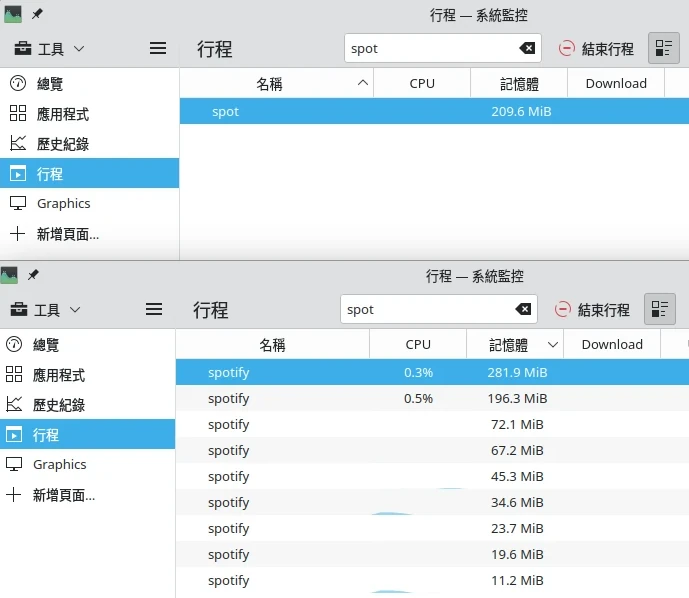 我還真的比較了二者的RAM佔用,Spot只有200MB上下,而Spotify官方客戶端隨便就500MB以上!