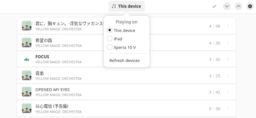 Spotify Connect怪怪的,雖然Spot能看到其他登入的Spotify裝置但不能切換播放,從Spotify官方客戶端亦看不到Spot播放的音樂。看來這個功能必須要兩台Linux電腦都跑Spot才能切換播放。