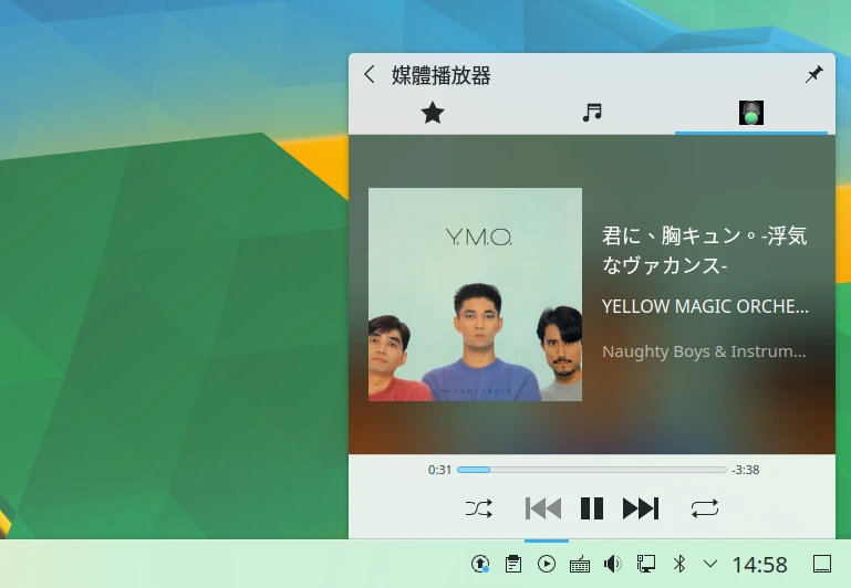 善用Spot所支援的MPRIS標準,在桌面環境的工具列顯示音樂控制播放器,例如這是KDE系統內建的畫面,GNOME需要安裝Mpris Label。