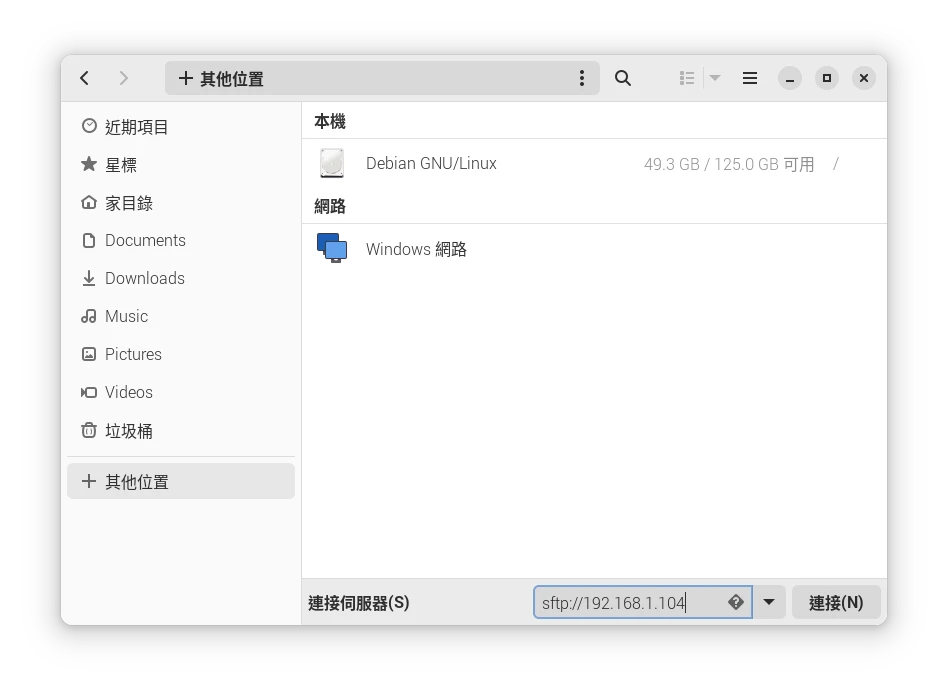 如果你使用GNOME桌面,開啟GNOME檔案管理器,點選其他位置 → 連接到伺服器,輸入sftp://伺服端的IP,再輸入帳號密碼連線。GNOME背後會透過GVfs掛載SSHFS。
