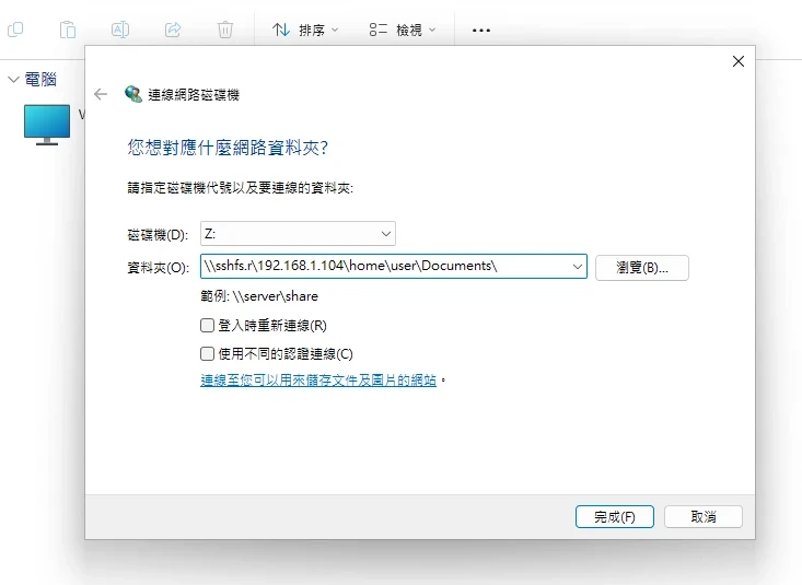 \\sshfs.r\伺服端IP\伺服端路徑\,按下Enter,輸入伺服端的帳號密碼即可連線。請注意Windows的路徑是\反斜線。