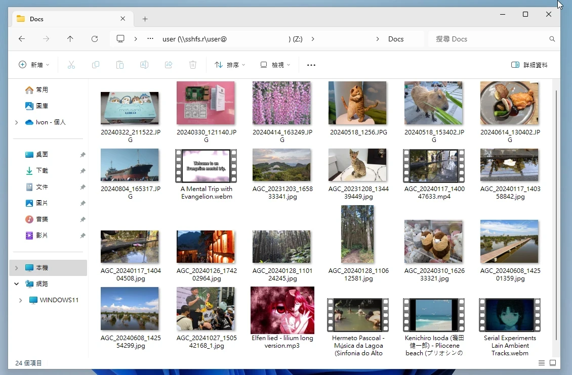 圖例,透過Windows檔案總管掛載SSHFS,檢視遠端Linux電腦的檔案。