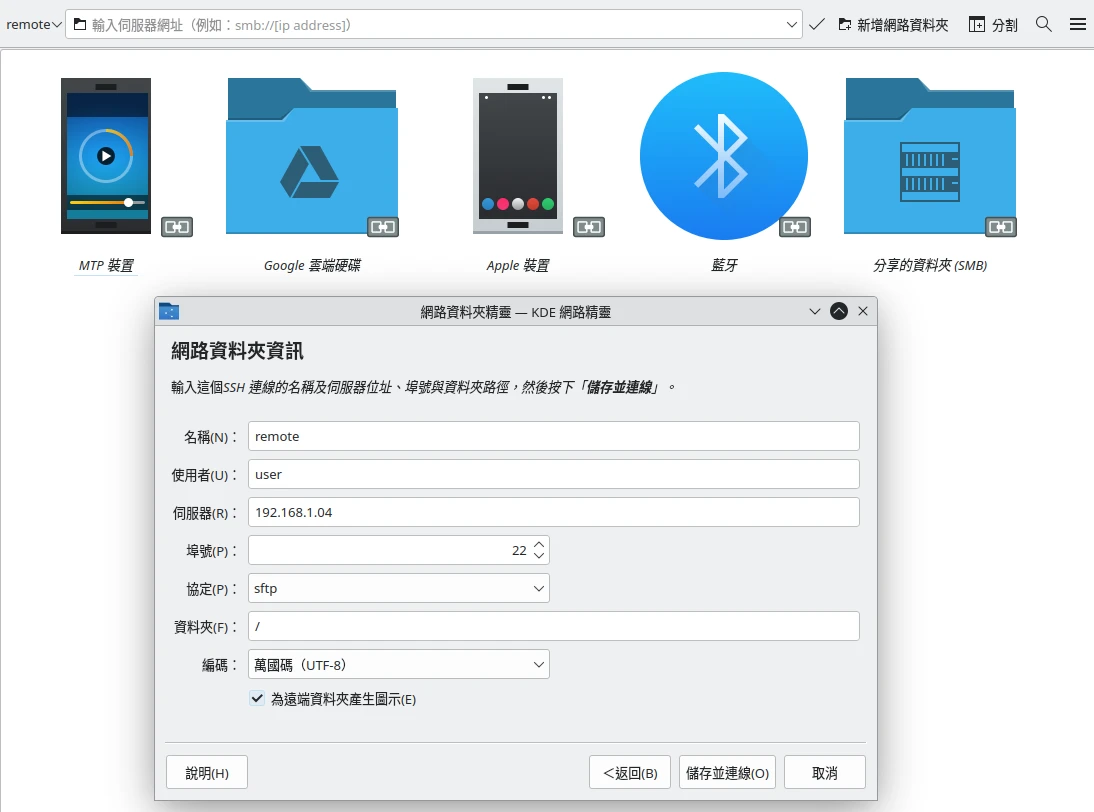 如果你使用KDE Plasma桌面,使用SSH指令登入伺服端一次。接著再開啟Dolphin檔案管理器,點選網路,新增網路資料夾,選SFTP,輸入IP與帳號密碼連線。KDE背後會透過KIO掛載SSHFS。