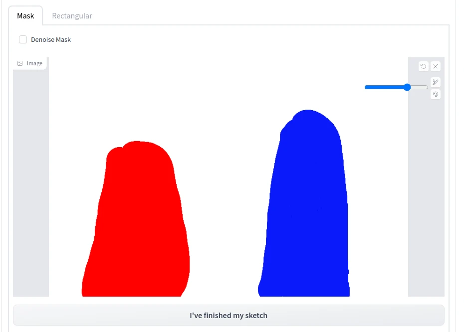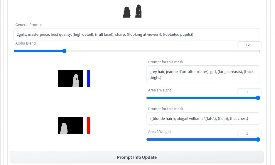 I've finished my sketch,下面就會顯示各個色塊的分割狀況。依序填入提示詞:在General Prompt填入畫風和背景的提示詞,藍筆部份填入貞德Jeanne d'Arc相關的提示詞,紅筆部份填入艾比蓋兒Abigail Williams的相關提示詞