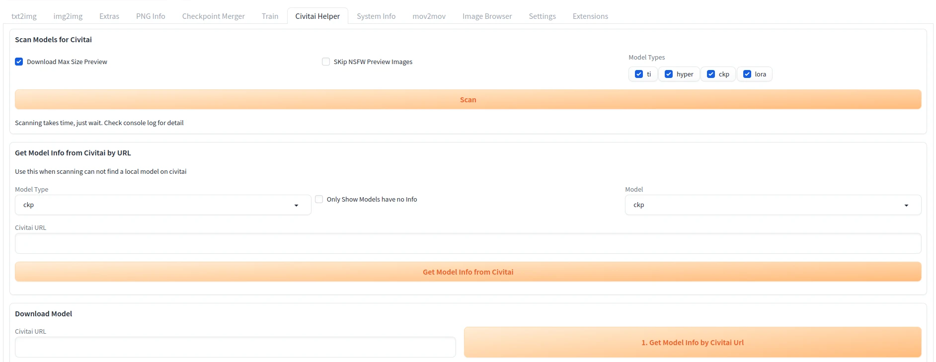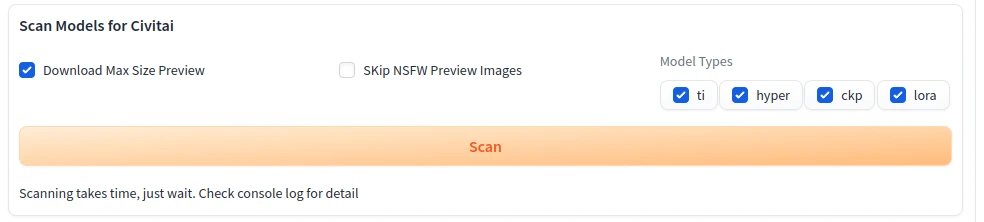 點選橘色的Scan按鈕,它就會自動比對本機模型(存檔點、嵌入、超網路、LoRA)的資料,從CivitAI下載模型縮圖。