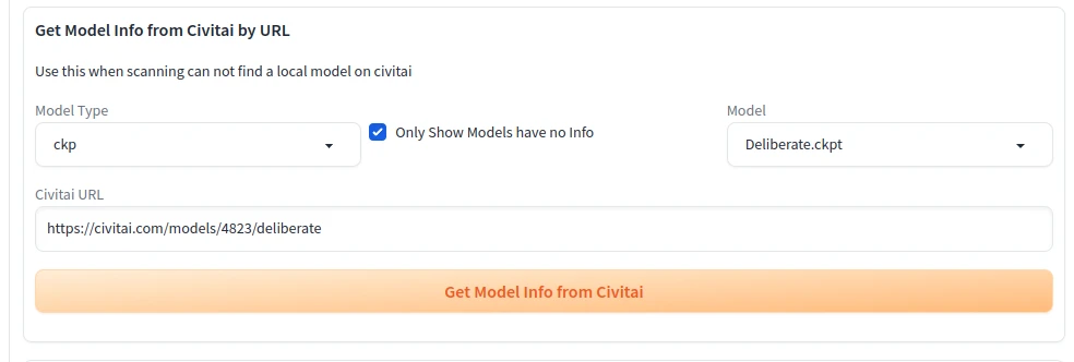 於Civitai URL的欄位填入模型的網址(就是你用瀏覽器所看到的網址),例如這裡我選擇Deliberate這個本機模型。