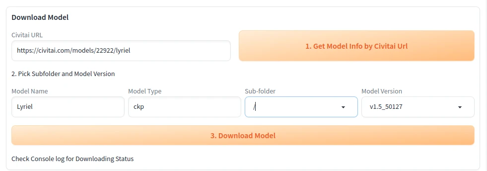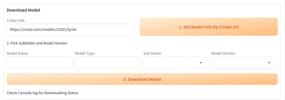 Civitai URL欄位填入模型的網址(就是你用瀏覽器所看到的網址),點選1. Get Model Info by Civitai Url取得該頁面的資料。