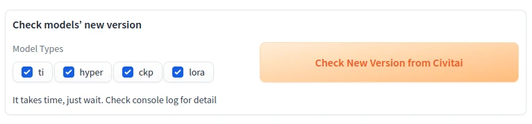 將Model Types全部打勾,點選Check New Version from Civitai,若有新版模型它就會自動下載。