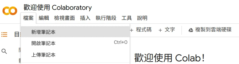 至Google Colab,點選新增筆記本。
