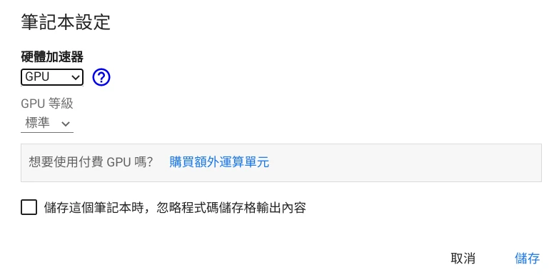 點選執行階段 → 變更執行階段,選取使用GPU