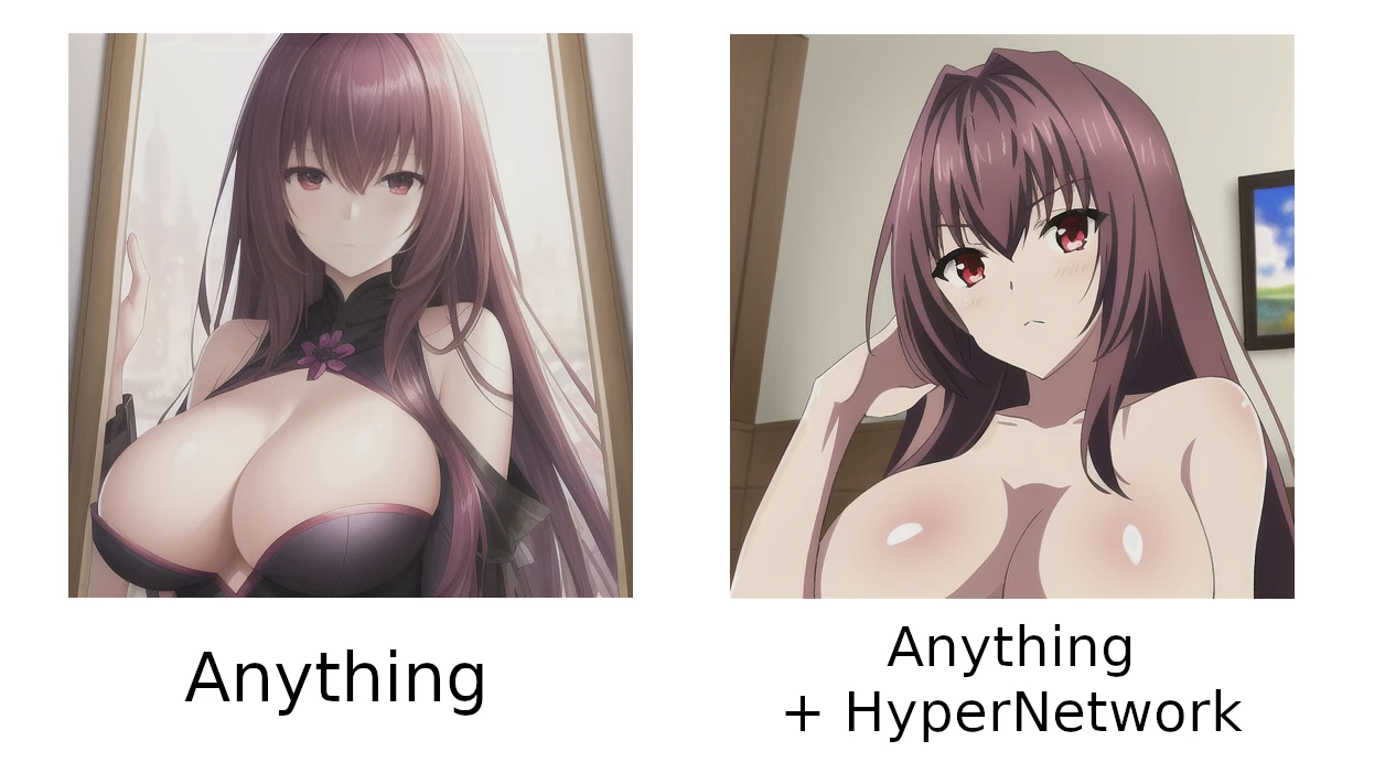 以下是一個具體例子,透過使用自行訓練的HyperNetwork,便改善單靠Anything模型無法生成出Hara老師畫風的缺點。在不使用HyperNetwork的情況下,風格永遠是左邊那樣;一使用HyperNetwork,右邊的風格就能輕鬆生成出來了。