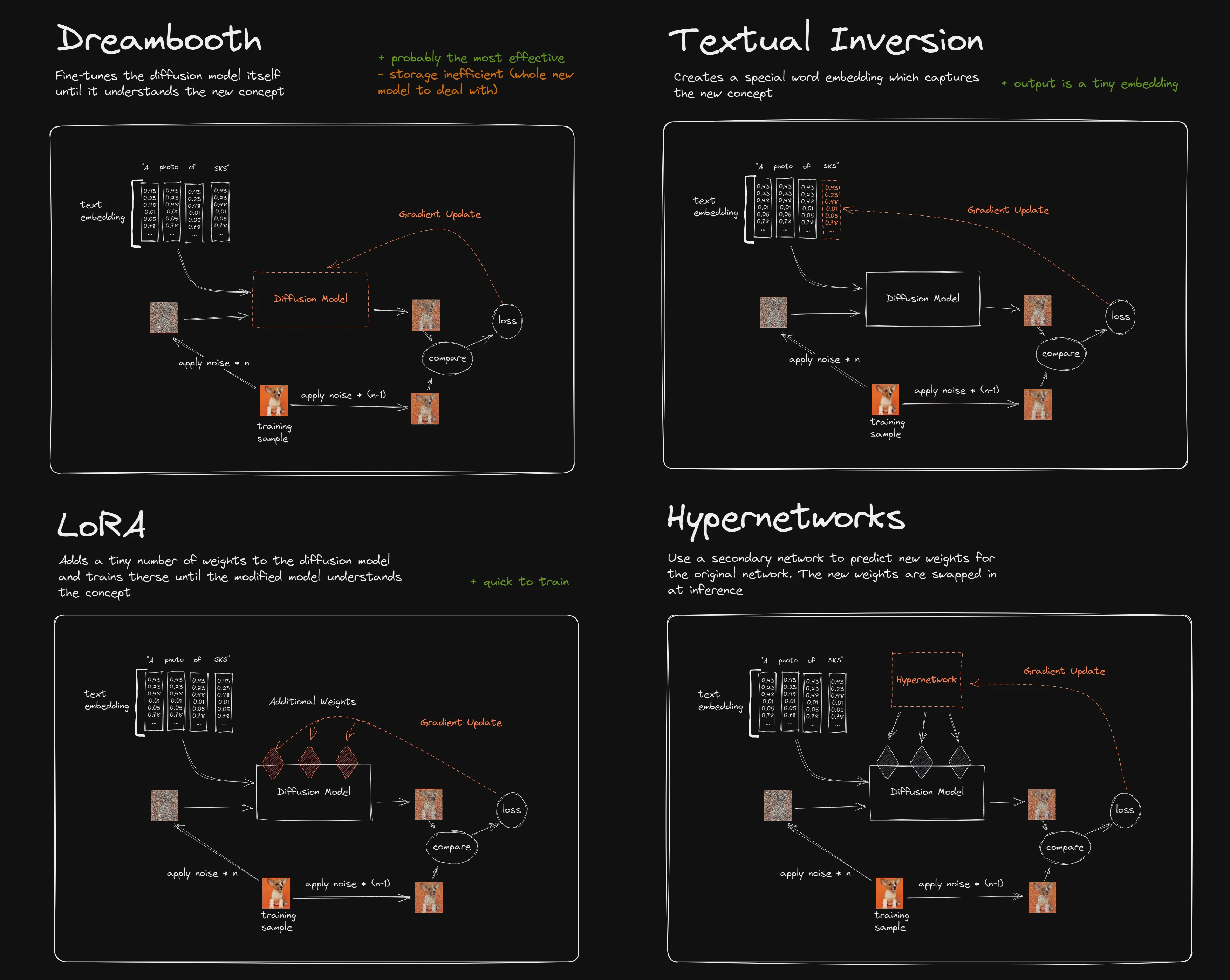 各個模型的原理差異請參考下圖。技術原理以及訓練參數設定請參閱「參考資料」一章,礙於篇幅無法一一細講,本章以操作過程為主。