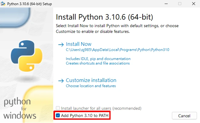 Add Python 3.10 to PATH,將Python加到環境變數。再按Install Now。