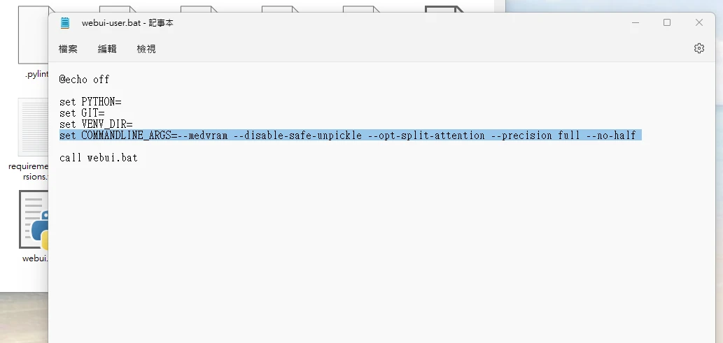 若顯示卡VRAM在8GB以上,將set COMMANDLINE_ARGS=替換成set COMMANDLINE_ARGS=--enable-insecure-extension-access引數。