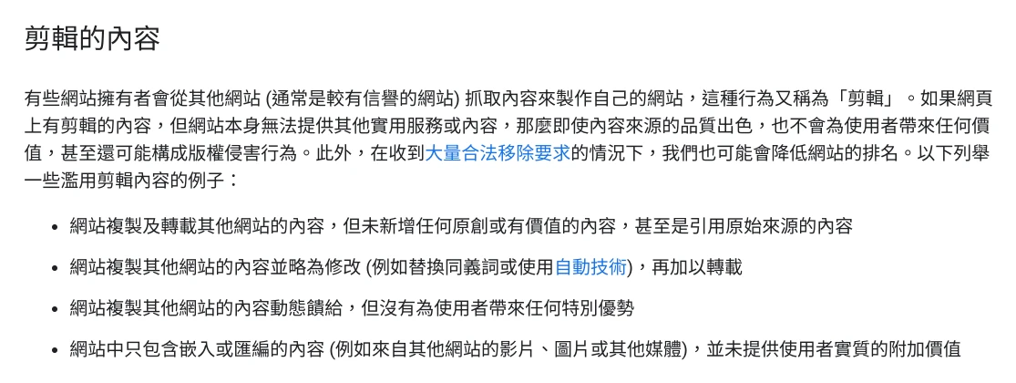 Google有詳細解釋垃圾內容的處理機制:檢舉垃圾內容、付費連結或惡意軟體,裡面有提到何為垃圾內容,例如「剪輯」: