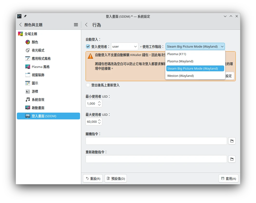 nmcli device set wlan0 autoconnect yes指令設定Wifi開機自動連線,並編輯藍牙設定/etc/bluetooth/main.conf,啟用AutoEnable=true自動連線。如果要開機自動登入Gamescope,就修改顯示管理器設定。例如我使用SDDM,就在KDE的系統設定,開啟自動登入Gamescope工作階段。