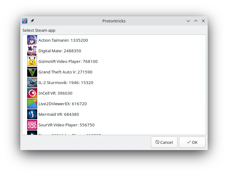 Protontricks圖形界面啟動後,會要你選擇Steam遊戲的容器再操作。如果列表看不到你要的遊戲,