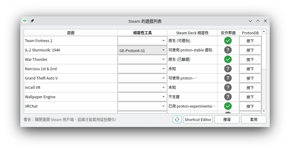 以上操作在Wine環境下可以用Winetricks達成,但是Steam並沒有提供此工具。於是就有開發者寫了工具「ProtonUp-QT」和「ProtonTricks」,專門針對Steam Proton環境設計,方便我們調整遊戲的設定值。