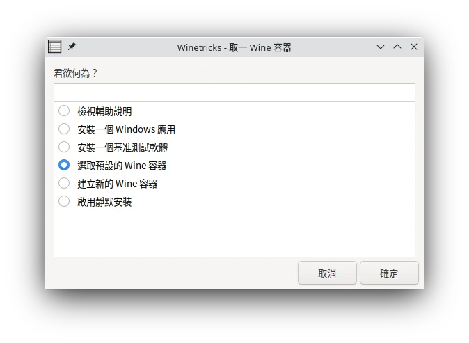 安裝一個Windows應用或.dll:快速安裝.Net framework、DirectX、Windows Media Player、Winrar等軟體。有些exe安裝的時候沒有進度條,需要等選取Wine容器的選單重新跳出來才代表exe安裝完成。