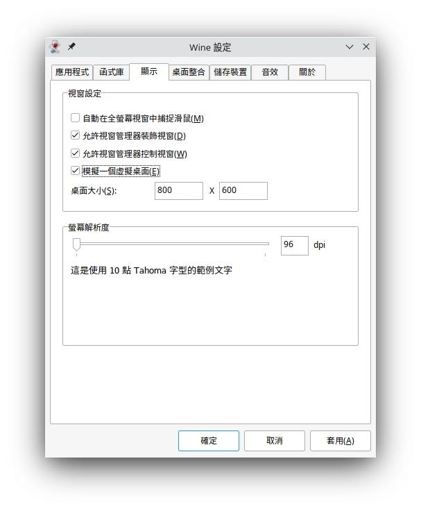 執行Wine設定程式:也就是winecfg,在這裡可以設定字體大小(螢幕解析度DPI),勾選「模擬一個虛擬桌面」的話則會在啟動程式前開一個虛擬桌面出來,讓全螢幕的遊戲改成視窗化執行。