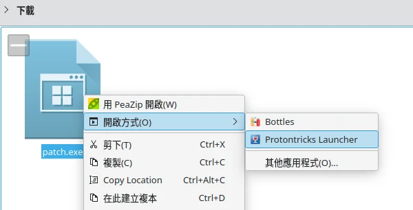 - 遊戲打補丁通常得透過exe操作。在你下載好補丁程式後,於Linux系統檔案管理器對exe按右鍵,選擇以Protontricks Launcher開啟,再選取遊戲程式的容器,即可將補丁安裝到那個遊戲的目錄。